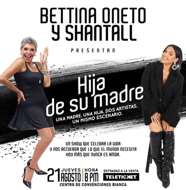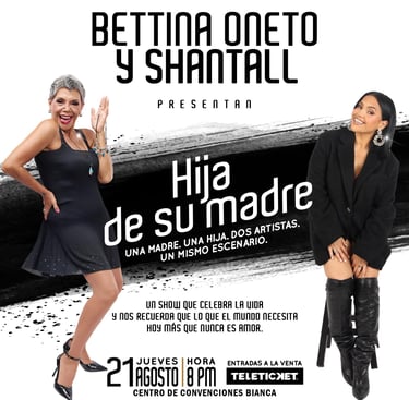 La incomparable Bettina Oneto, ícono del humor y el espectáculo peruano, se une a su hija Shantall, cantante, educadora y fundadora de la escuela Di-Voz para presentar "Hija de su madre", un espectáculo que promete emociones a flor de piel de madre e hija unidas por el arte, la música y el amor en un encuentro único este jueves de 21 de agosto en el Centro de Convenciones Bianca. ¡Las entradas ya están a la venta en Teleticket!