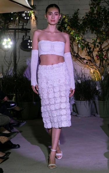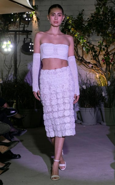 “Quise crear una colección con propósito. Incorporar tejido artesanal y algodón peruano fue una forma de pensar el diseño desde el tiempo, el oficio y el trabajo manual”, explica Daniela Coloma. Love Language – Bridal Tejido nace a partir de un proceso colaborativo con artesanas, en el que las técnicas de tejido manual se integran al diseño bridal contemporáneo como un elemento esencial del desarrollo creativo.