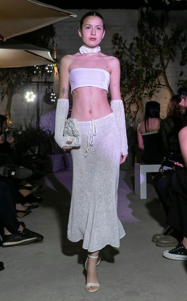 Dentro de la colección, las rosas tejidas a mano cumplen un rol protagónico en la identidad visual de la línea. Su desarrollo tomó cerca de tres meses hasta llegar a la primera muestra final, un proceso que terminó de definir el ritmo y el carácter del proyecto. “Ese tiempo marcó el camino de la colección. Entendí que respetar los procesos es parte fundamental del diseño”, señala Coloma.