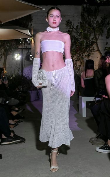 La colección se construye desde el diálogo entre dos técnicas tradicionalmente separadas en la moda nupcial: la estructura de la tela plana y la flexibilidad del tejido manual. Esta combinación define la identidad de la propuesta y marca una nueva aproximación al diseño bridal, tanto desde lo técnico como desde lo creativo.