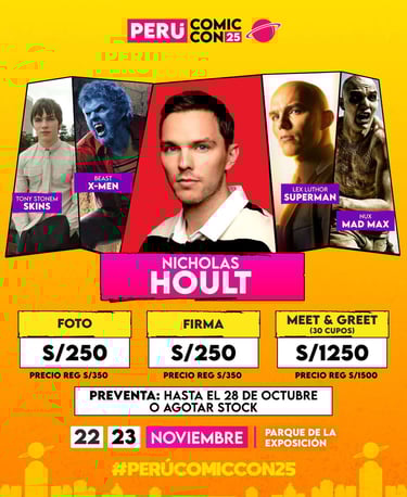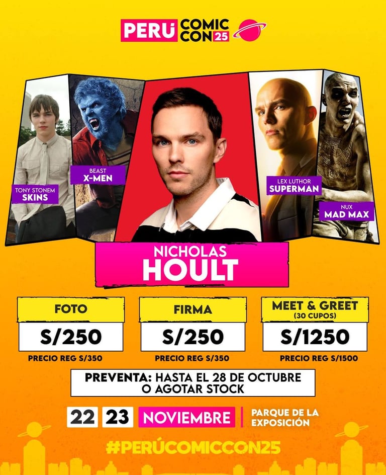 Lima, octubre de 2025.- El actor británico Nicholas Hoult, reconocido por sus papeles en Superman, X-Men, Mad Max: Fury Road y la serie The Great, confirmó oficialmente su visita al Perú para participar en la Perú Comic Con 2025, que se realizará los días 22 y 23 de noviembre en el Parque de la Exposición.