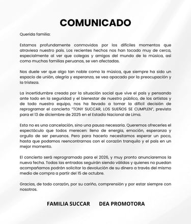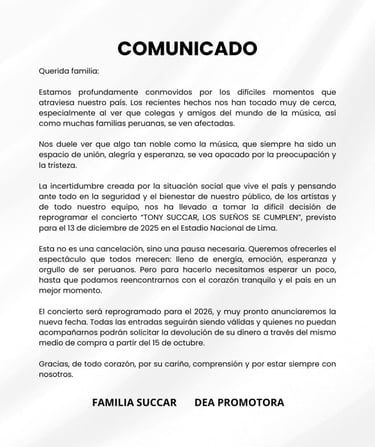 En el mensaje difundido por la Familia Succar y DEA Promotora, el artista expresa su profunda preocupación por los momentos de incertidumbre que vive el Perú, y manifiesta su solidaridad con las familias peruanas, colegas y amigos del mundo musical que se han visto directamente afectados. "Nos duele ver que algo tan noble como la música se vea opacado por la preocupación y la tristeza", señala el comunicado.